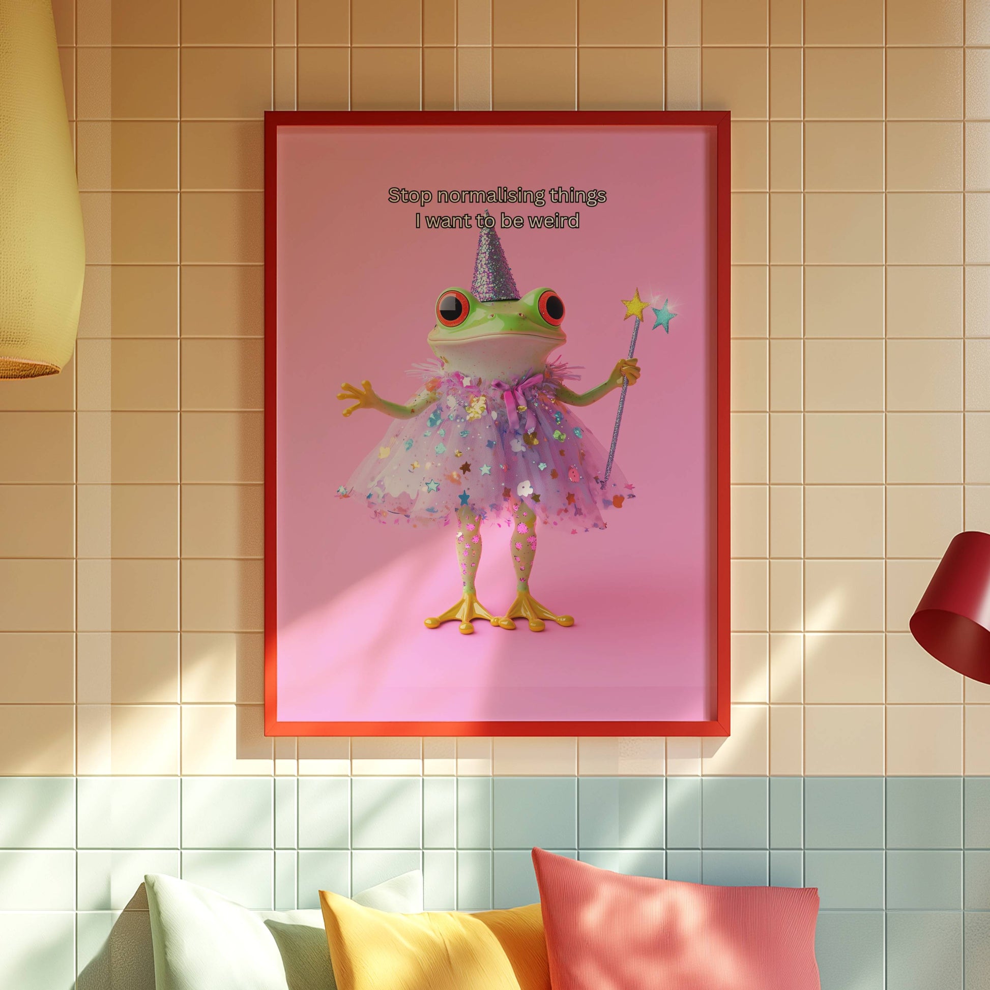 Sparkly fairy frog in full glitter drag, casting spells and chaos with iconic meme energy. A pink, powerful wall print for the delightful weridos.