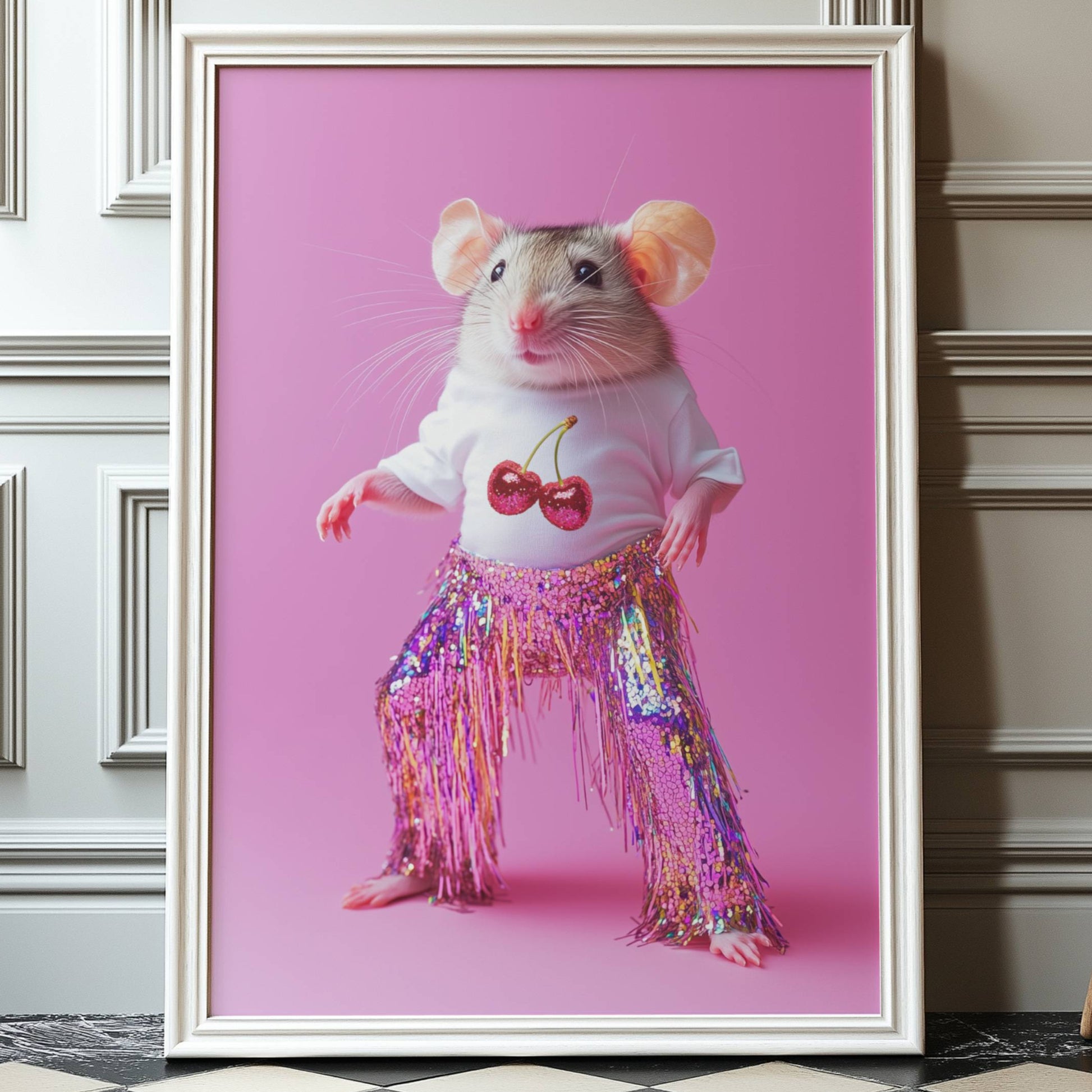 Furry glitter rat friend in our iconic cherry tee and sequinned pants, serving camp, chaos, and cuteness on a hot pink backdrop. The ultimate dopamine wall art for maximalist girlies.